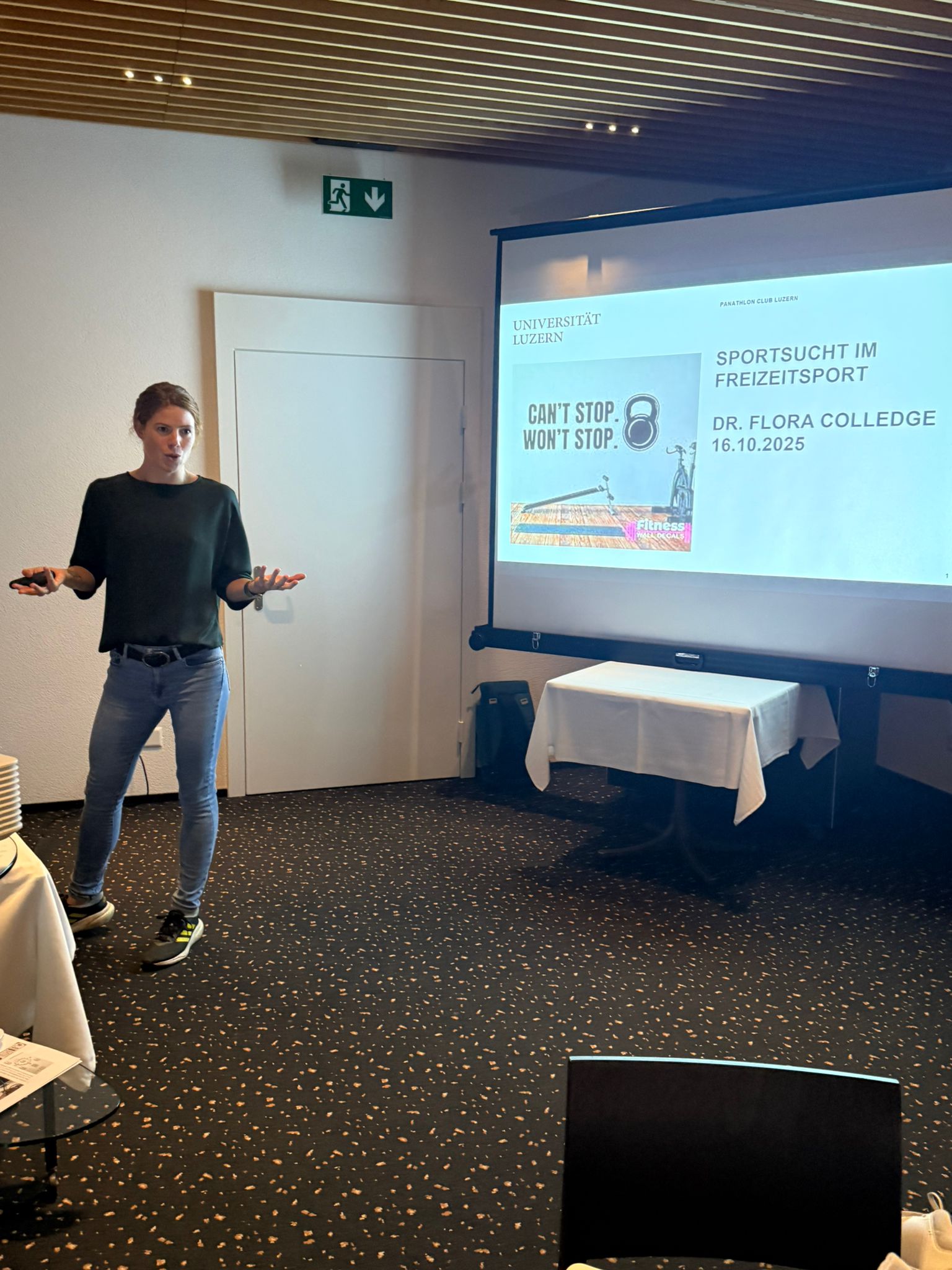 Dr. Flora Colledge hielt am Panathlon-Meeting vom 16. November 2025 ein Referat zu "Sportsucht und Freizeitsport". Die Belgierin forscht zu diesem Thema an der Universität Luzern, betreibt aber auch Spitzensport als Triathletin. So stand sie schon mehrmals auf dem Podest eines der härtesten Triathlons, dem Norseman-Triathlon in Norwegen (3,8 km Schwimmen im ca. 15° kalten Wasser, 180 km Radfahren mit einer Höhendifferenz von 3'300 m und 42,2 km Laufen mit einer Höhendifferenz von 1'800m). Sind solche Leistungen ohne Sportsucht möglich?